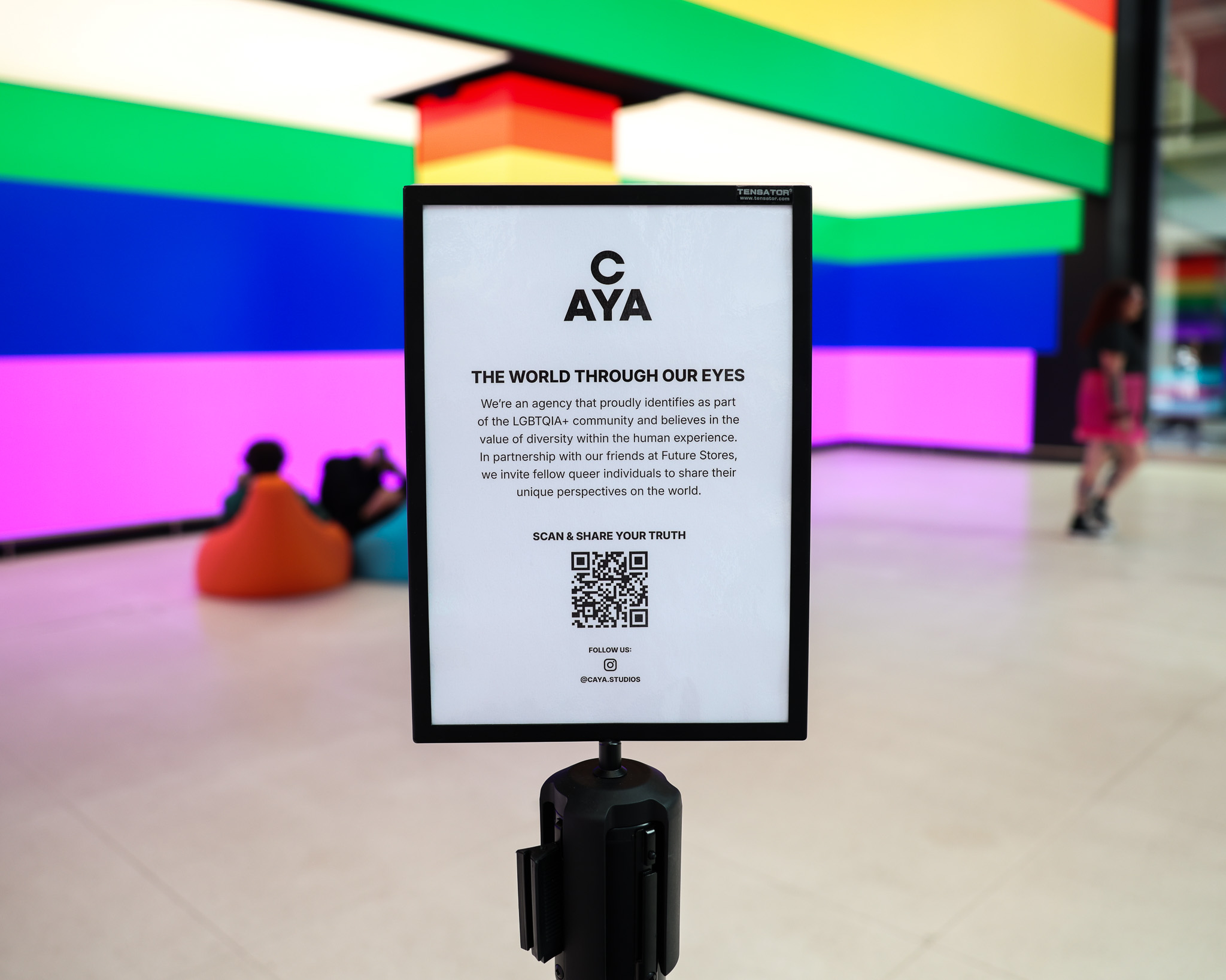 The live event was where all those truths came to life. We transformed Future Stores' Oxford Street space into a visual thunderclap of queer experience. Floor-to-ceiling ticker tapes, lit up in the colors of the progress flag, cascaded down the walls, each one a scrolling, living testimony.